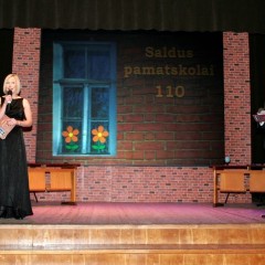 Ieskats svinīgajā pasākumā “Skola, mana pirmā, sarkanā”. Vadītāji – skolas absolventi Līga Zeļģe un Klāvs Vītiņš.