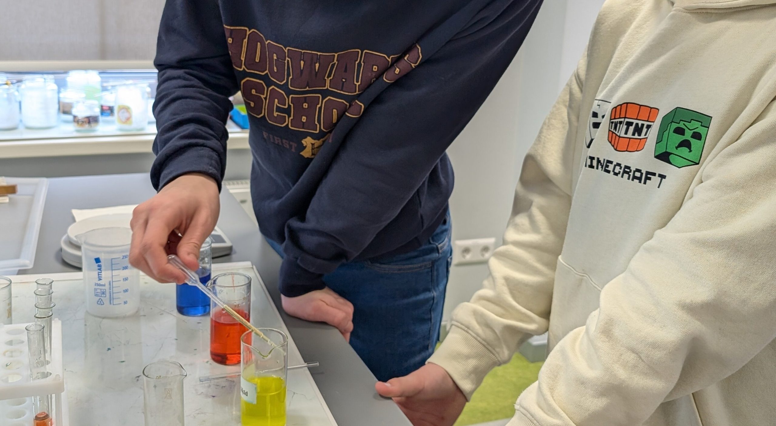 Izmantojot dažādos blīvuma krāsainos šķīdumus, skolēni arī iemācījās izveidot krāsainu, slāņainu šķidrumu, uzmanīgi lejot vienu šķīdumu virs otra.