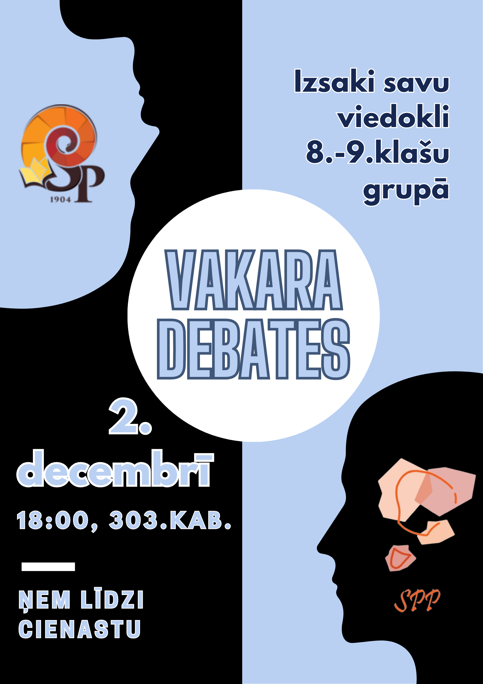 Debates ir lieliska iespēja iesaistīties diskusijās, izteikt viedokli un dalīties idejās, kā arī stiprināt saikni starp skolēniem, skolotājiem un vecākiem. Diskusijas notiks par aktuālām un interesantām tēmām, kas rosina domāt, sadarboties un kopīgi meklēt risinājumus.