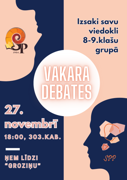 Debates ir lieliska iespēja iesaistīties diskusijās, izteikt savu viedokli un dalīties idejās, kā arī veidot ciešāku saikni starp skolēniem, skolotājiem un vecākiem. Diskusijas norisināsies par aktuālām un saistošām tēmām, kas rosina domāt un sadarboties.